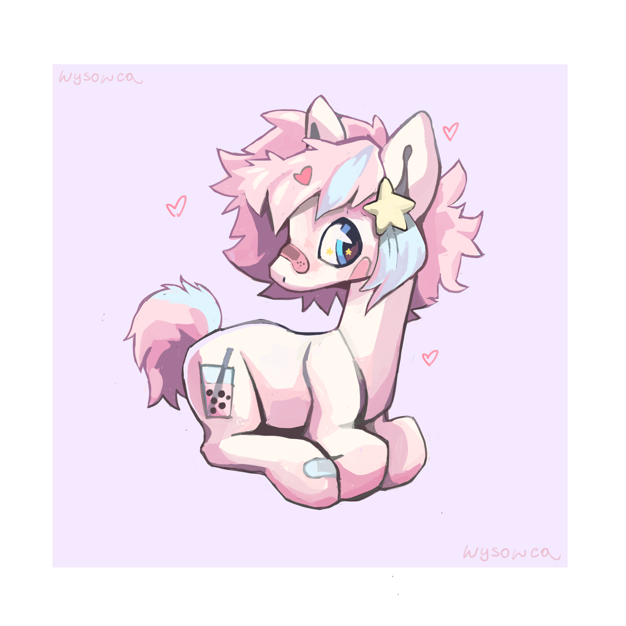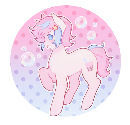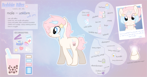 Bubble Bliss works at a juice cart with his special somepony, Fruity Float. The two stallions built the cart together over a shared love for delicious drinks and a search for purpose.