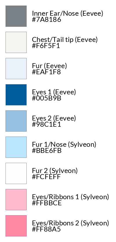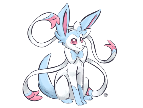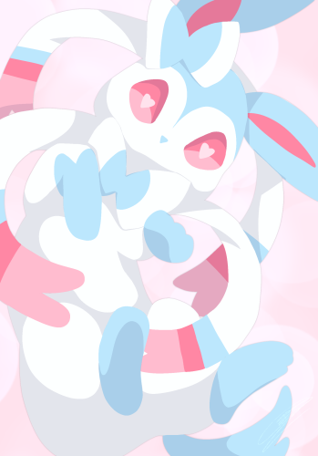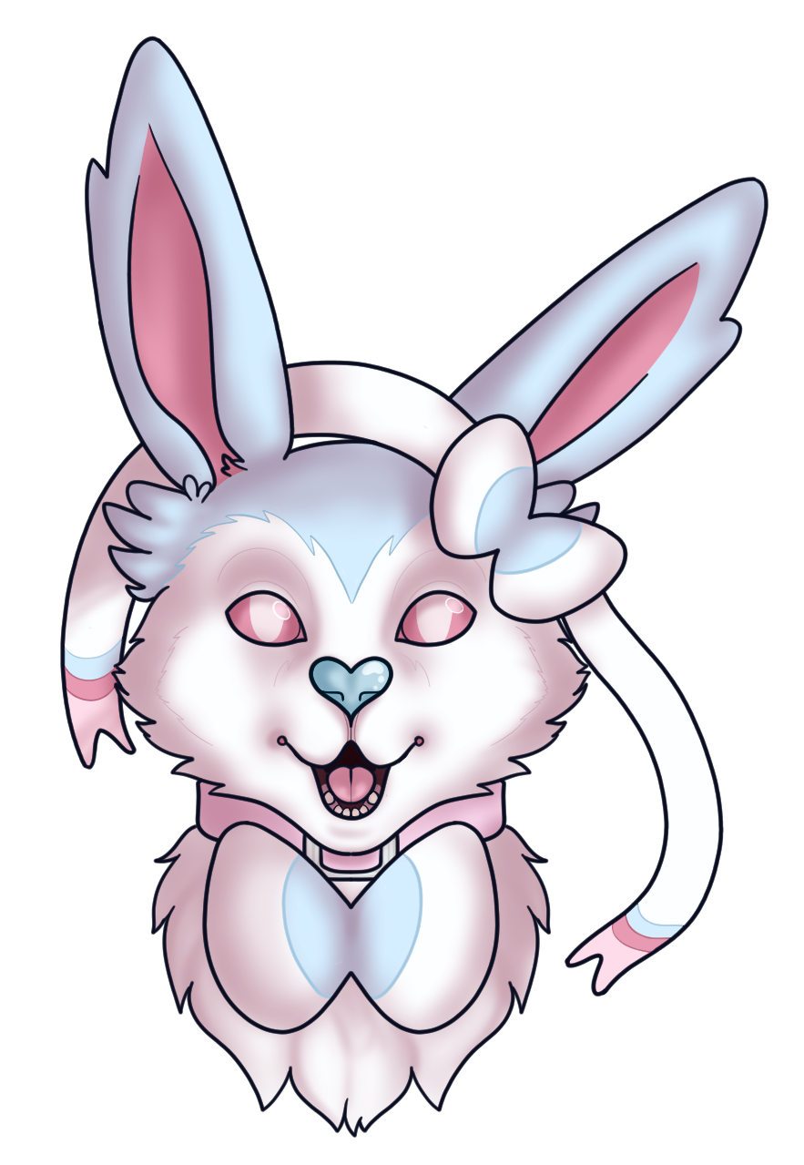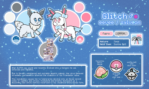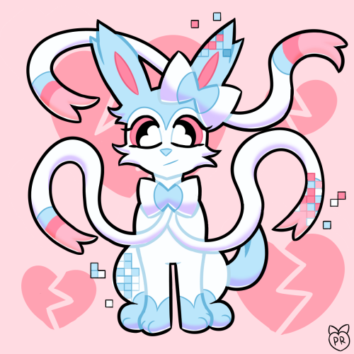 Glitch is a small shiny Sylveon ♂ with Eevee-like proportions and extra fluffy, light-colored fur.